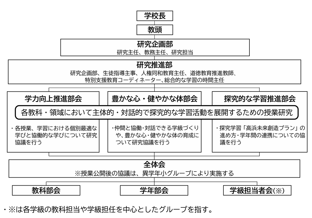 昨年度は、全教員がこれまで以上に主体的・対話的に研究をすすめることを意図して、3部会から構 成される研究組織を設定した。しかし、スクールプラン等校内の他の取組との連携が取りづらく、活動の広がりや深まりがあまり見られなかった。そのため、再度研究部会を見直し、新たな部会の設定を考えた。今年度は、①学力向上推進部会 ②豊かな心・健やかな体部会 ③探究的な学習推進部会を設定し、スクールプランと連動させ、授業力の向上を目指す。各部会に様々な教科・学年部会の教員が所属 することで教科・学年間の連携をさらに強め、子どもたちの学びが深まるようにする。