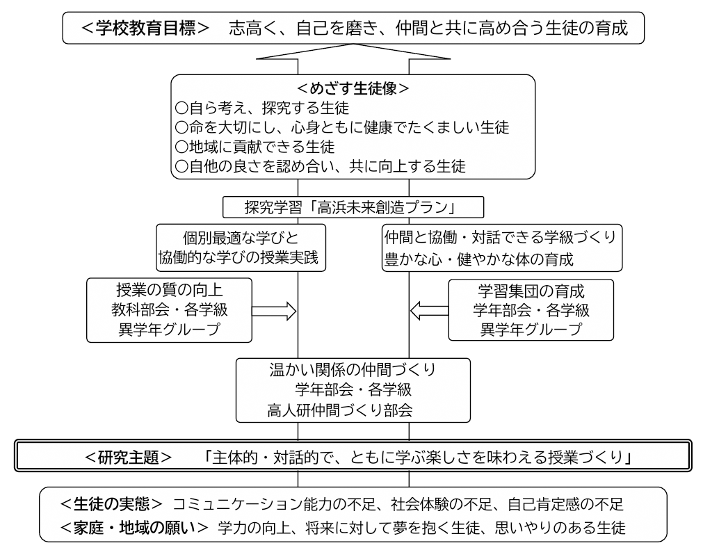 本校では、一昨年度から「高浜未来創造プラン」と題して、自分の興味関心をもとに、地域の課題を解決する探究的な学習に取り組んでいる。