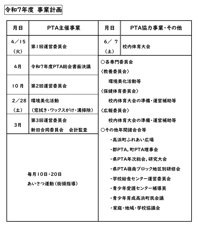 本校PTAは、児童の健全な成長を図ることを目的とし、親と教師とが協力して、学校及び家庭における教育に関し、理解を深め、その教育の振興につとめ、さらに、校外における生活の指導、地域における教育環境の改善、充実を図るため会員相